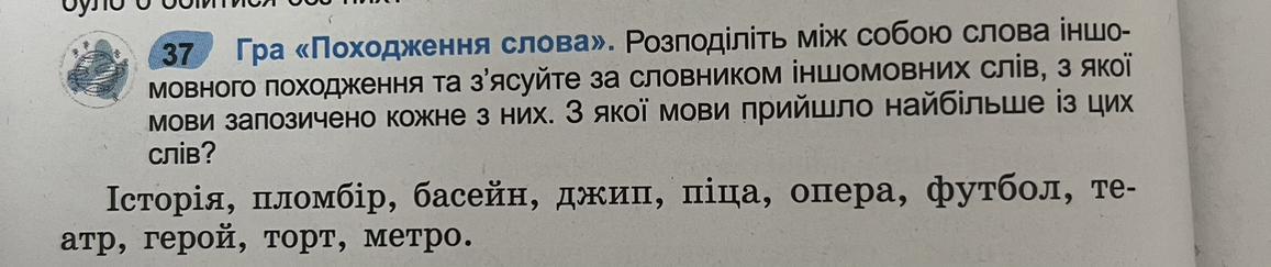 Історія — грецького походження, пломбір — французького походження, басейн — франц., джип — англ., піца — італ., опера — італ., футбол — англ., театр — франц., герой — грец., торт — італ., метро — франц.