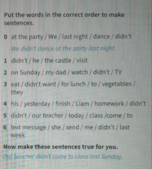 3 Put the words in the correct order to make sentences. 0 at the party/We/ last night/dance/ didn't We didn't dance at the party last night. 1 didn't/ he/the castle / visit 2 on Sunday/my dad/watch/ didn't/ TV 3 eat / didn't want / for lunch/to/ vegetables / they 4 his/ yesterday / finish/Liam/homework/didn't 5 didn't/our teacher / today/class/come / to 6 text message/she/send/me/didn't/ last week Now make these sentences true for you. Out Leucher didn't come to class last Sunday.
