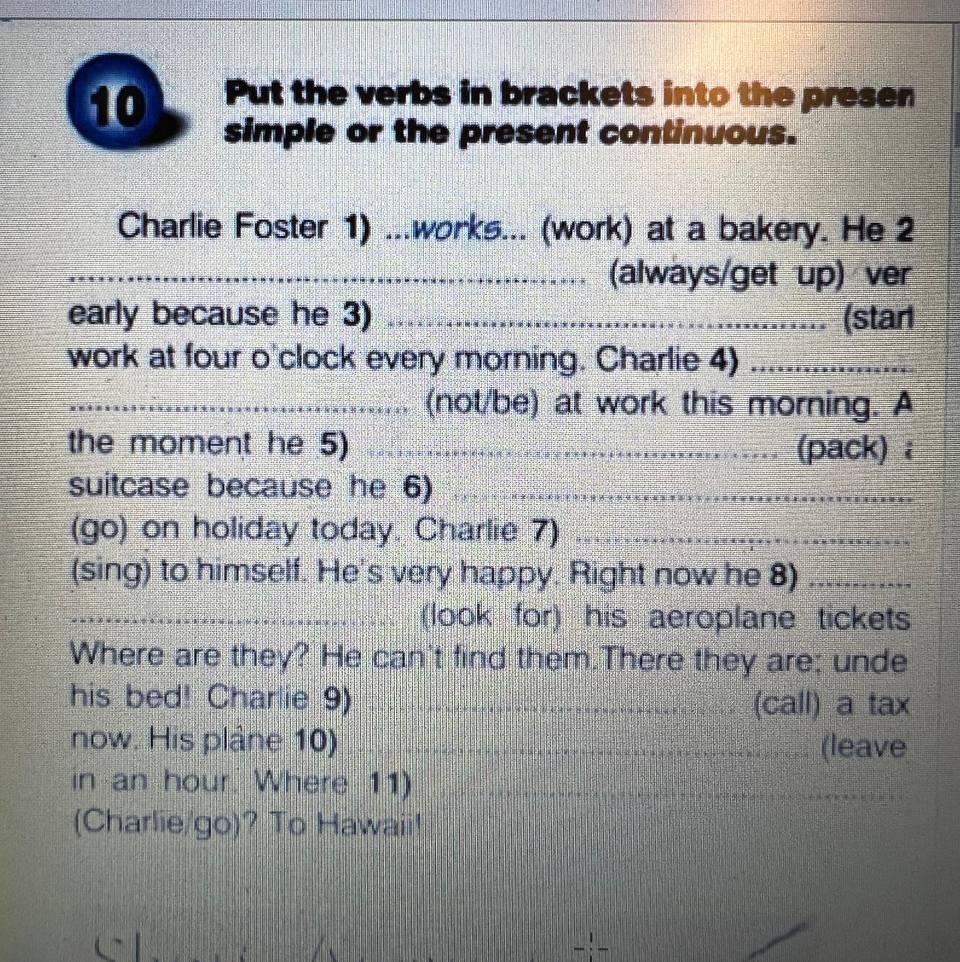 Charlie Foster (1) WORKS at a bakery. He (2) ALWAYS GETS UP every early because he (3) STARTS work at four o'clock every morning. Charle (4) ISN'T at work this morning, at the moment he (5) IS PACKING a suitasase because he (6) IS GOING on holiday today. Charlie (7)IS SINGING to himself. He is very happy. Right now he (8) IS LOOKING FOR his plane tickets. Where are they? He can't find them. There they arге; under his bed! Charlie (9) IS CALLING a taxi now His plane (10) LEAVES in a hour. Where (11) IS HE GOING? To Hawaii!