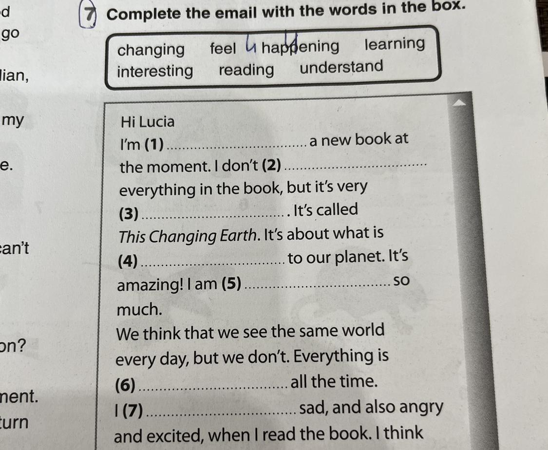 I'm (1) learning a new book at the moment. I don't (2) understand everything in the book, but it's very (3) interesting. It's called "This Changing Earth." It's about what is (4) happening to our planet. It's (5) changing SO much.