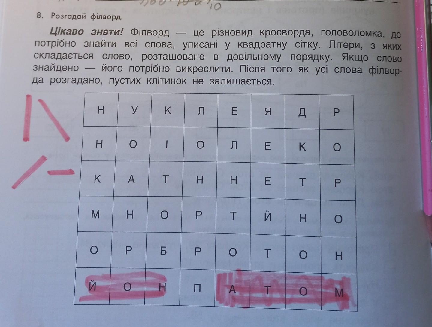 8. Розгадай фiлворд. Цікаво знати! Фiлворд це рiзновид кросворда, головоломка, де потрібно знайти всі слова, уписані у квадратну сітку. Літери, з яких складається слово, розташовано в довільному порядку. Якщо слово знайдено його потрібно викреслити. Після того як усі слова фiлвор- - да розгадано, пустих клітинок не залишається будьласка не просто слово а і показати