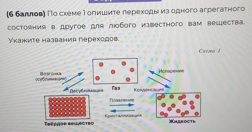 ПОЖАЛУЙСТА СРОООЧНОООО ДАЮ 20 БАЛЛОВ по схеме 1 опишите переходы из одного агрегатного СОСТОЯНИЯ В другое для любого известного вам вещества. Укажите названия переходов.