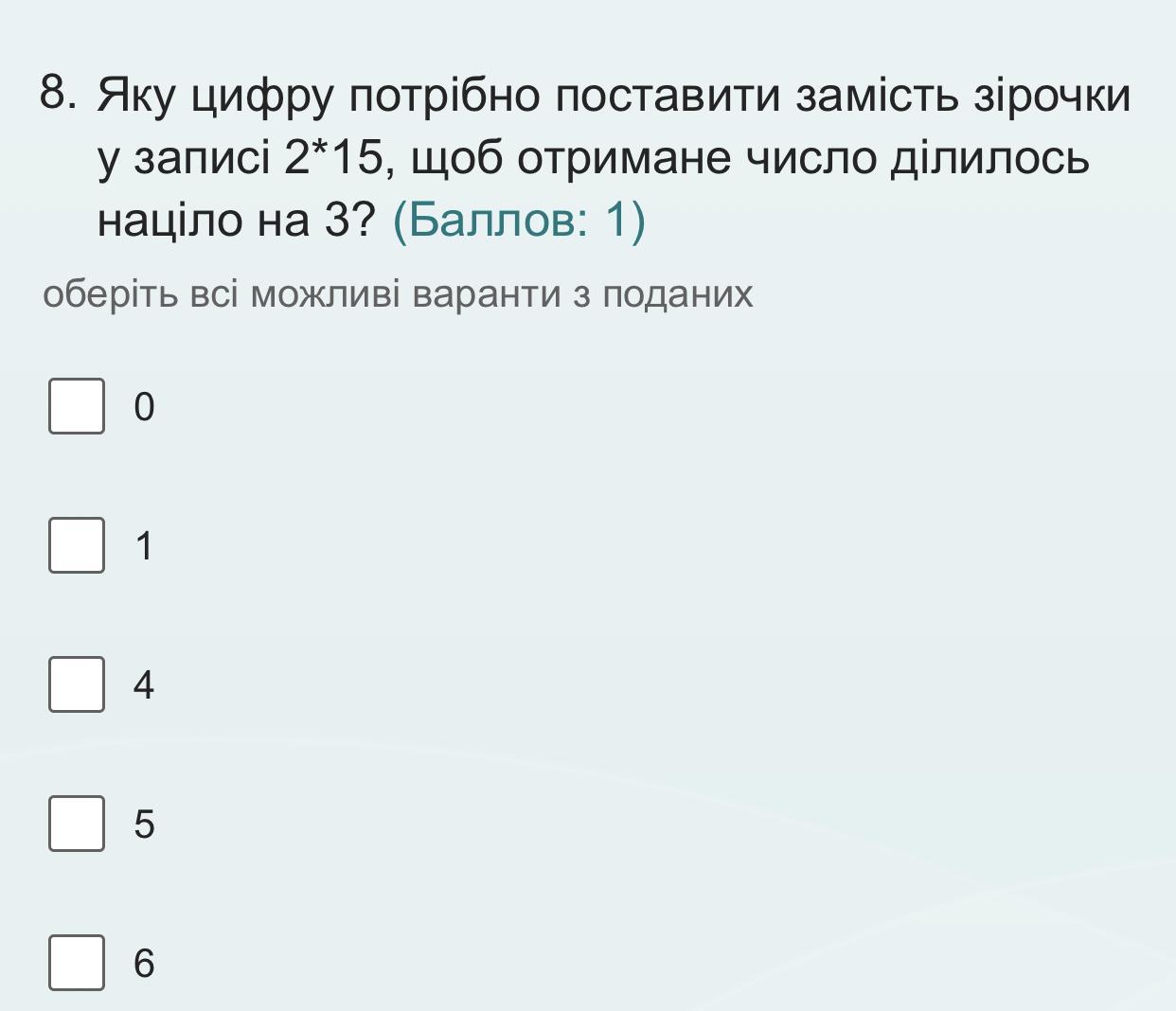 Яку цифру потрібно поставити замість зірочки у записі 2*15, щоб отримане число ділилось націло на 3? Помогите пожалуйста
