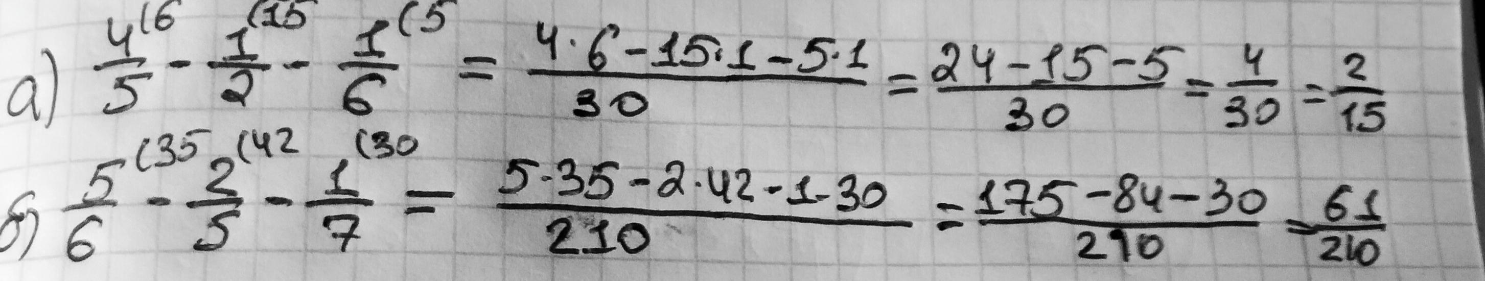5/6 - 2/5 - 1/7 = 175/210 - 84/210 - 30/210 =
