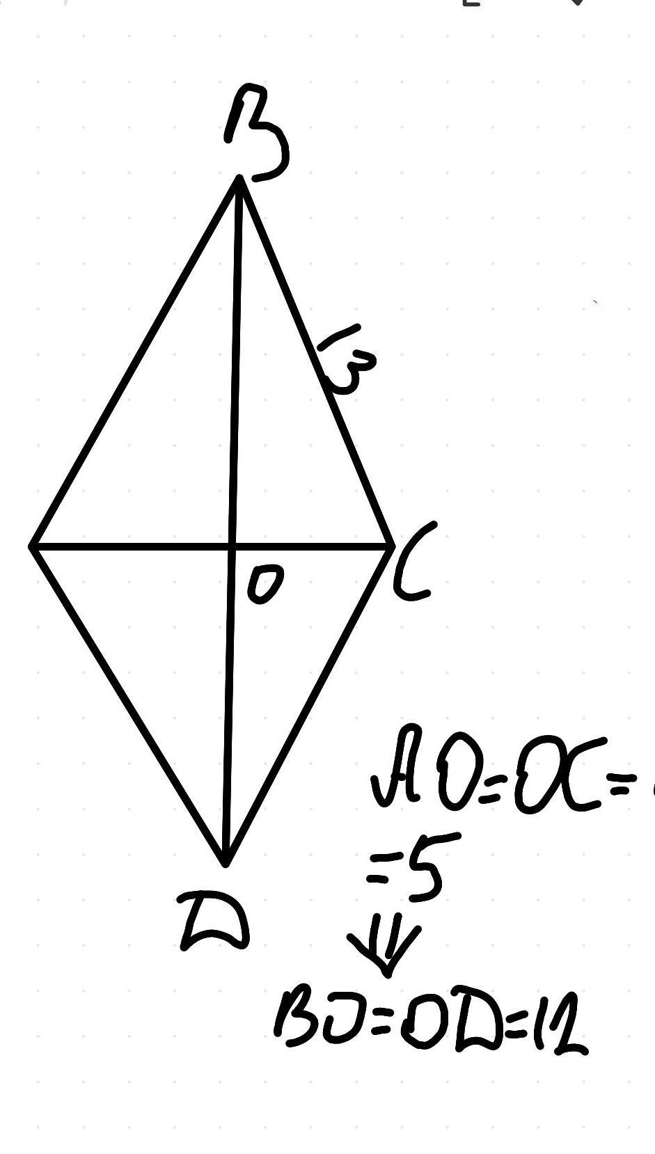 Далее следует вспомнить что диагонали в точке пересечения делятся пополам ( и пересекаются под прямым углом) , чтоб найти вторую диагональ найдем для начала его половину ( по рисунку видно ) . по теореме пифагора найдем половину внорой диагонали :