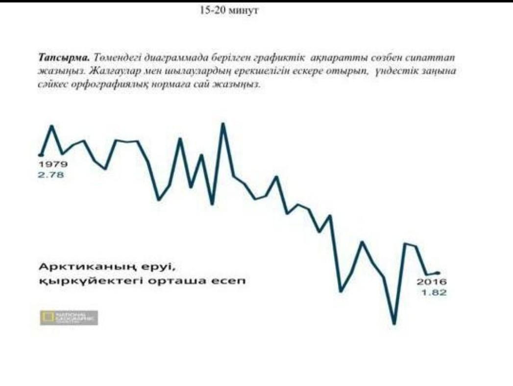 Тапсырма. Төмендегі диаграммада берілген графиктік ақпаратты созбен сипатman жазыныз. Жалгаулар мен шылаулардың ерекшелігін ескере отырып, үндестік заңына сәйкес орфографиялық нормага сай жазыныз. www 1979 2.78 15-20 минут Арктиканың еруі, қыркүйектегі орташа есеп LRewrinc W 2016 1.82
