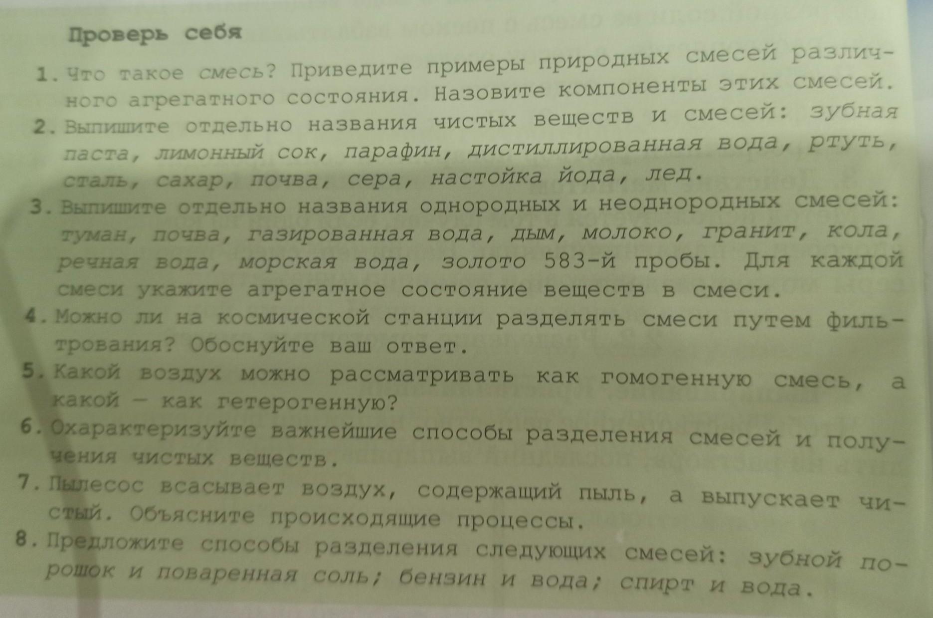 Ответ: Смеси бывают твердые, жидкие, газообразные, коллоидные.Твердые бывают сыпучими и сплавами.В быту - смеси круп, мельхиор, сталь и т. д. В природе песок, почва, камень - (многокомпонентный твердый раствор)Жидкие бывают растворами и коллоидными. Раствор чай, соль или - сода в воде, В природе вода морская и минеральнаяКоллойные растворы гели, шампуни, клеи. В природе болотная торфяная вода, молоко,