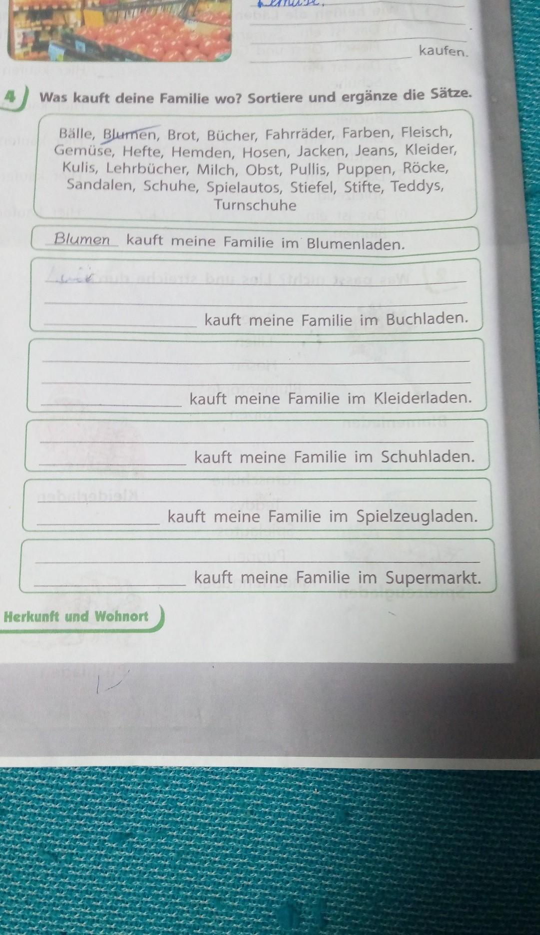 Btot, Fleisch, Gemüse, Milch, Obst kauft meine Familie in Supermarkt