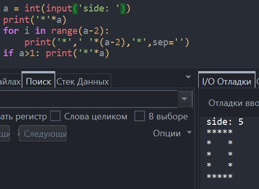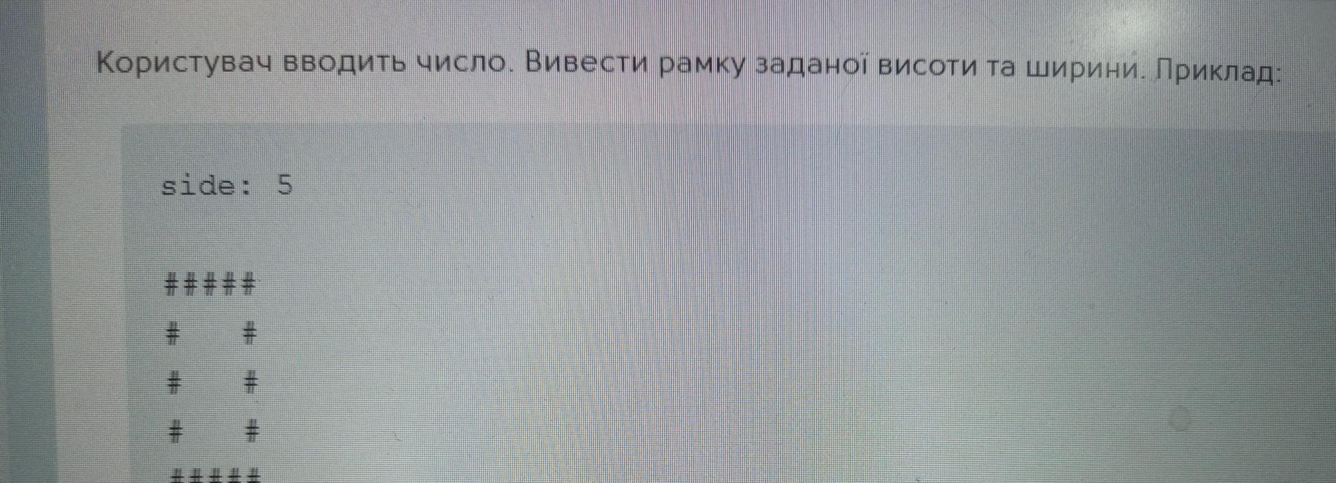 Користувач вводить число. Вивести рамку заданої висоти та ширини. Приклад: side: 5