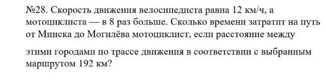 Скорость движения велосипедиста равна 12 км/ч,а мотоциклиста -в 8 раз больше.Сколько времени затратит на путь от Минска до Могилева мотоциклист,если расстояние между этими городами по трассе движения в соответствии с выбранным маршрутом