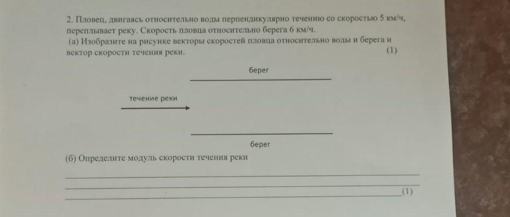 2. Пловец, двигаясь относительно воды перпендикулярно течению со скоростью 5 км/ч. переплывает реку. Скорость пловца относительно берега 6 км/ч. (a) Изобразите на рисунке векторы скоростей пловца относительно воды и берега и вектор скорости течения реки. (1) течение реки (б) Определите модуль скорости течения реки берег берег (1)