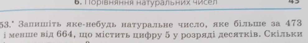 Запишіть яке-небудь натуральне число,яке більше за 473 і менше від 664,що містить цифру 5 у розряді десятків. Скільки існує таких чисел?
