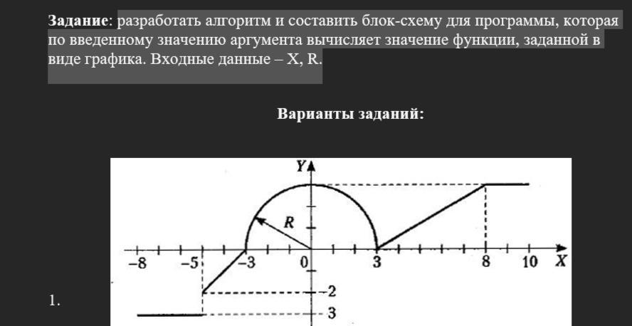 Разработать алгоритм и составить блок-схему для программы, которая по введенному значению аргумента вычисляет значение функции, заданной в виде графика. Входные данные – X, R.
