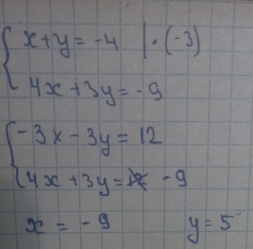 7. (26). Розв'яжіть систему рiвнянь: x+y=-4, (4x +3y=-9