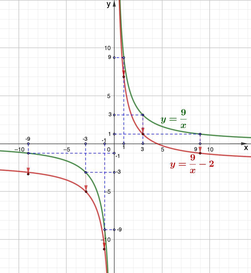Дана функция y=9/x-2 Построй график функции y=9/x-2. Найди вершины и построй график