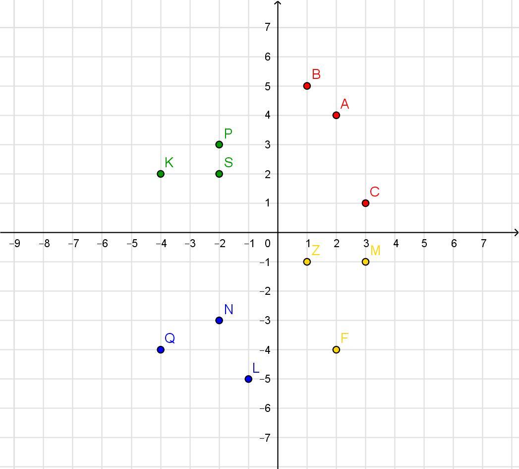 Позначте:а)червоним кольором точки А(2,4),В(1,5),С(3,1),б)зеленим точки К(-4,2),Р(-2,3),s(-2,2),в)синім L(-1,-5),Q(-4,-4)N(-2,-3)г)жовтим M(3,1)F(2,-4),Z(1,-1).Що ви помітили?