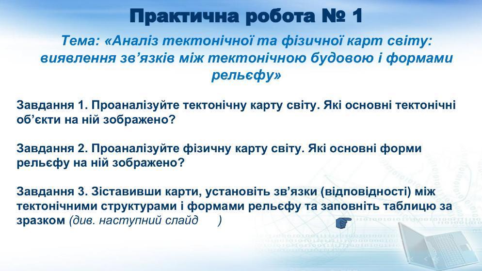 1. Проаналізувавши тектонічну карту світу, можна зробити висновок про різноманітність тектонічних об’єктів. Основні тектонічні об’єкти, які зображені на ній, включають платформи, щити, чехли, області складчатості (байкальської, каледонської, герцинської, мезозойської, кайнозойської)