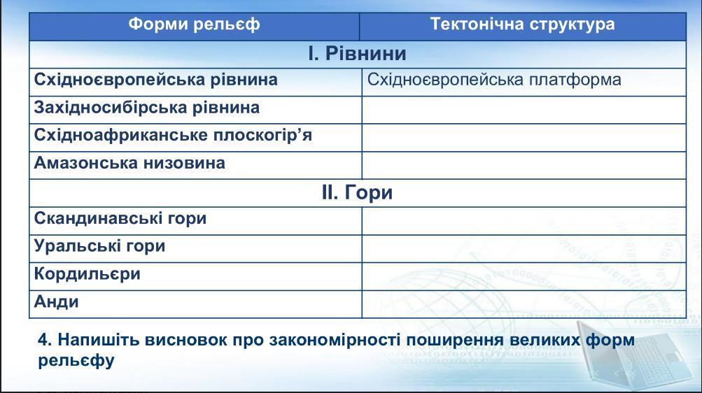 Висновок: Великим формам рельєфу, таким як рівнини та гори, в основному відповідають тектонічні структури, такі як платформи та складчастості. Розташування цих форм рельєфу на Землі залежить в основному від геологічної історії та тектонічних процесів, що впливають на ландшафт