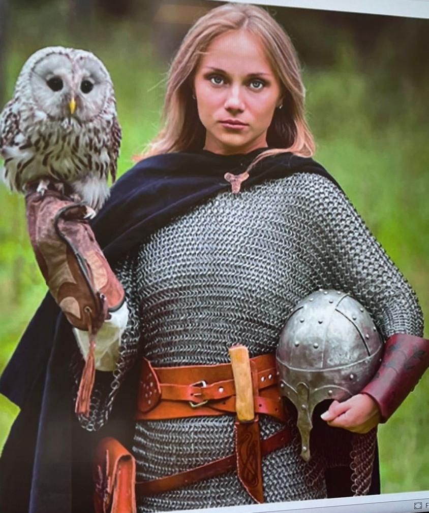 Девушка в доспехах привлекает внимание своим внешним видом и грациозной осанкой. Её невозмутимое лицо выражает смелость и уверенность, а глаза идеально и ясно скрывают свои мысли. Распущенные светло русые волосы свободно падают по её плечам, придавая образу естественности и женственности. На её талии находится коричневый пояс, на котором виден нож - символ её определённости и боевого мастерства. В её руках она держит шлем у талии, подчеркивая свою готовность к битве и стойкость перед испытаниями. На её руке сидит сова, символ мудрости и интеллекта, что говорит о способности девушки принимать рациональные решения и быть непревзойдённой в своей деятельности. Коричневый пояс, туго обтягивающий ее талию, является не только стильным аксессуаром, но и полезным помощником. На нем крепится прочный нож, который всегда готов помочь в исполнении ее обязанностей и защите себя.