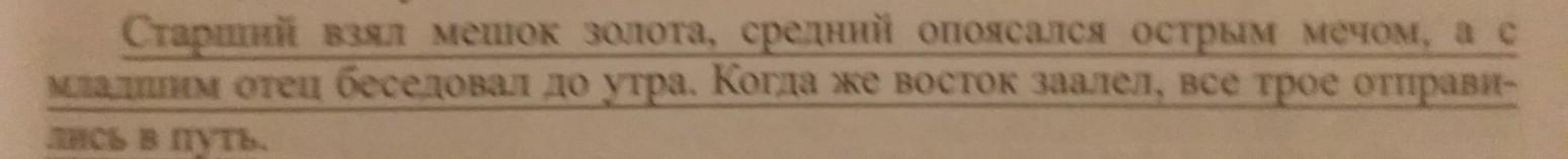 Имена сущ.: мешок (м.р., 2 скл.), золото (ср.р., 2 скл.), мечом (м.р., 2 скл.), отец (м.р., 2 скл.), утра (ср.р., 2 скл.), восток (м.р., 2 скл.), путь (м.р., разносклоняемое).