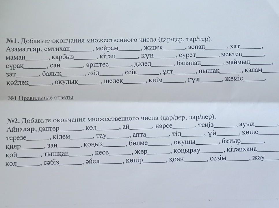 дәптерлер, көлдер, айлар, нәрселер, теңіздер, ауылдар, терезелер, кілемдер, таулар, апталар, тілдер, үйлер, көшелер, қиярлар, заңдар, қоңыздар, бөлмелер, оқушылар, батырлар, қойлар, тышқандар, кеселер, жерлер, қоңыраулар, кітапханалар, қолдар, сәбіздер, әйелдер, көпірлер, қояндар, сезімдер, жаулар.
