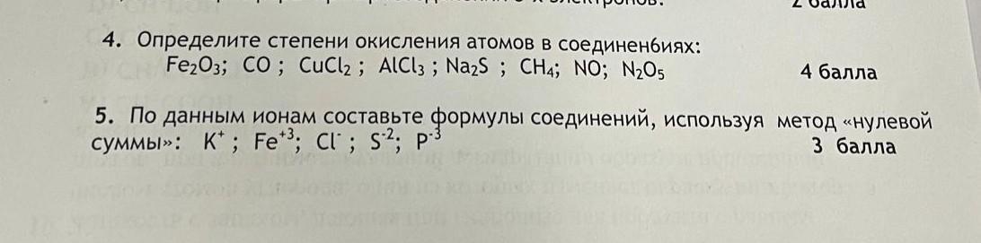 4. Определите степени окисления атомов в соединенбиях: Fe2O3; со; CuCl2; AlCl3; Na2S; CH4; NO; 2 4 балла