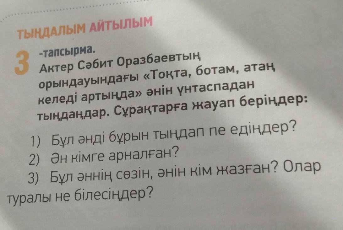 ТЫҢДАЛЫМ АЙТЫЛЫМ -тапсырма. Актер Сәбит Оразбаевтың орындауындағы «Тоқта, ботам, атаң келеді артыңда» әнін үнтаспадан тыңдаңдар. Сұрақтарға жауап беріңдер: 3 1) Бұл әнді бұрын тыңдап пе едіңдер? 2) Ән кiмге арналған? 3) Бұл әннің сөзін, әнін кім жазған? Олар туралы не білесіңдер?