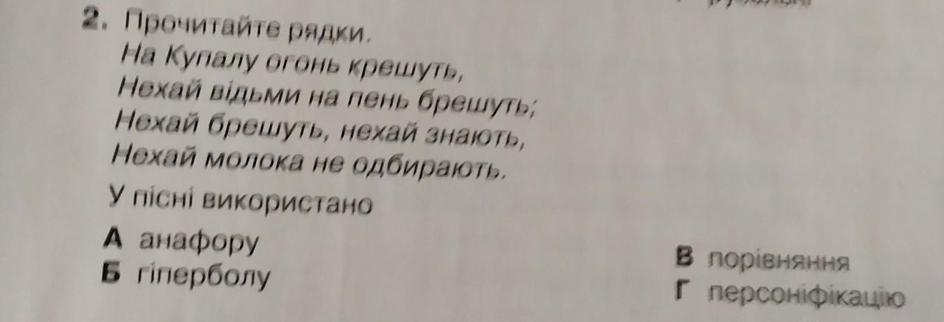 2. Прочитайте рядки. На Купалу огонь крешуть, Нехай відьми на пень брешуть; Нехай брешуть, нехай знають, Нехай молока не одбирають. У пісні використано А анафору Б гіперболу в порівняння Г персоніфікацію
