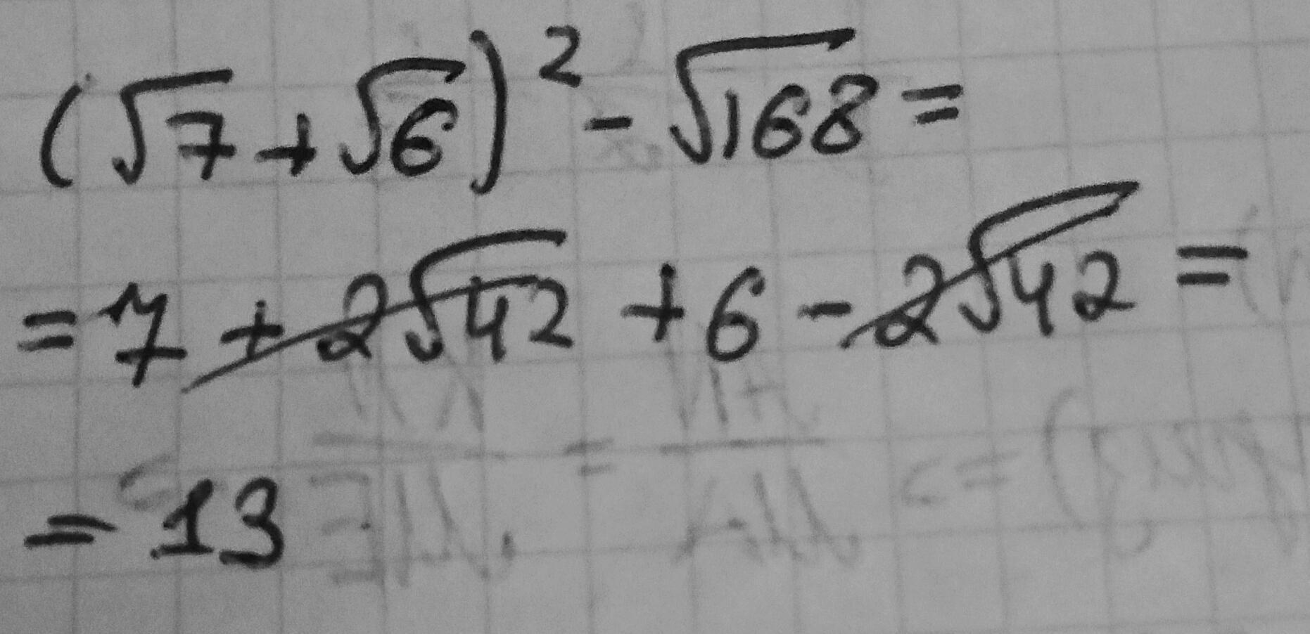 (√7+√6)²-√168=(√7²+2√6*√7+√6²)-√168=(7+2√42+6)-√42*4=7+2√42+6-2√42=7+6=13