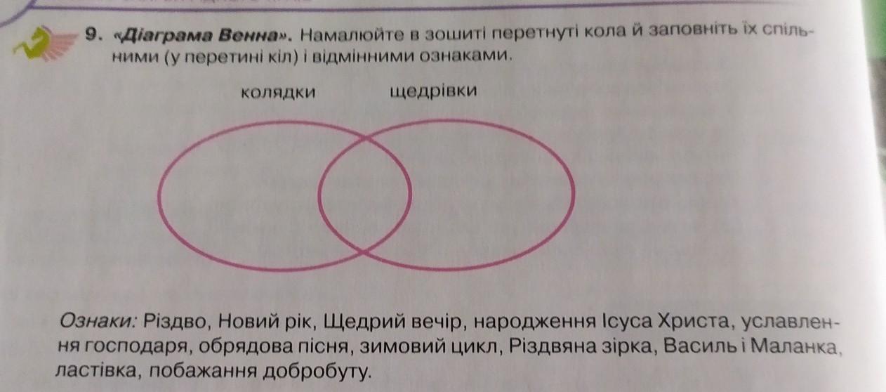 ПІСЕННІ СКАРБИ РIДНОГО КРАЮ 9. «Діаграма Венна». Намалюйте в зошиті перетнуті кола й заповніть їх спіль- ними (у перетині кіл) і відмінними ознаками. Колядки щедрівки Ознаки: Різдво, Новий рік, Щедрий вечір, народження Ісуса Христа, уславлен- ня господаря, обрядова пісня, зимовий цикл, Рiздвяна зірка, Василь і Маланка, ластівка, побажання добробуту. Сроооооочнооооооо