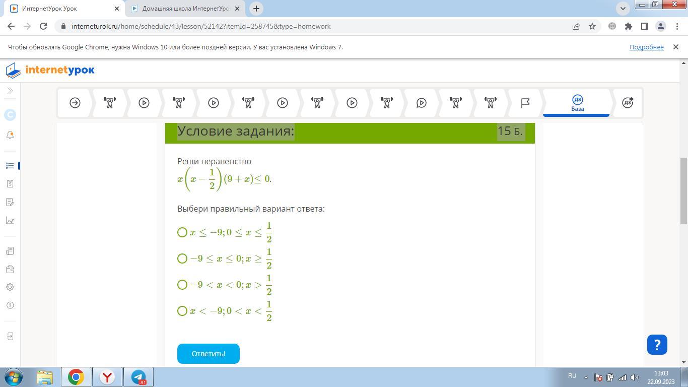 Реши неравенство x(x−12)(9+x)≤0. Выбери правильный вариант ответа:
