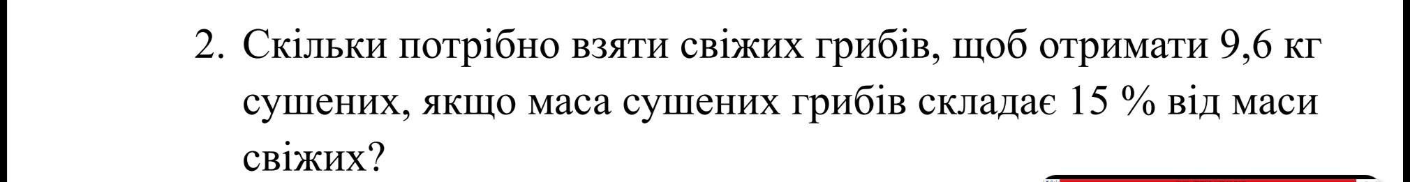 Для виробництва 9,6 кг сушених грибів, маса яких становить 15% від маси свіжих грибів, потрібно знайти масу свіжих грибів.