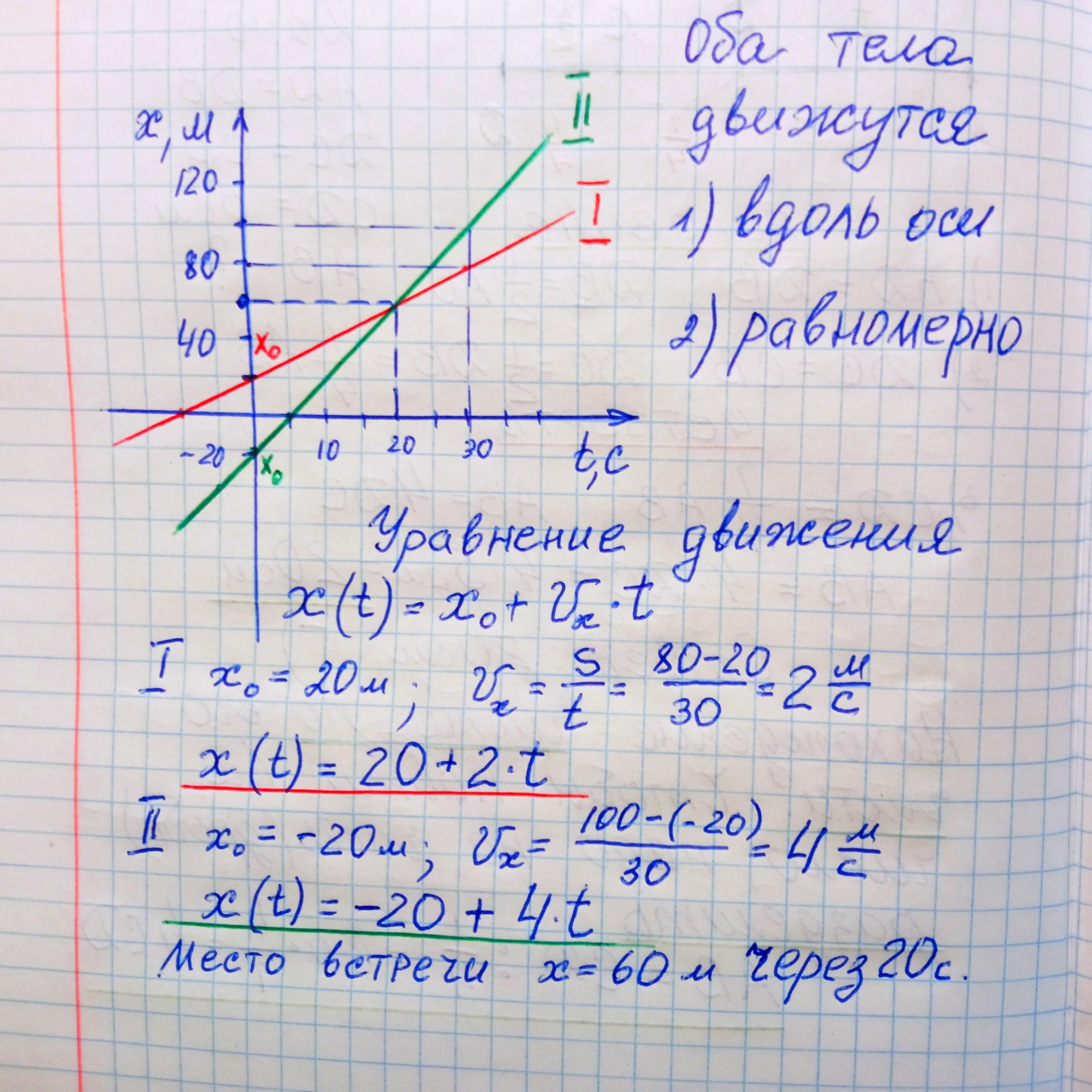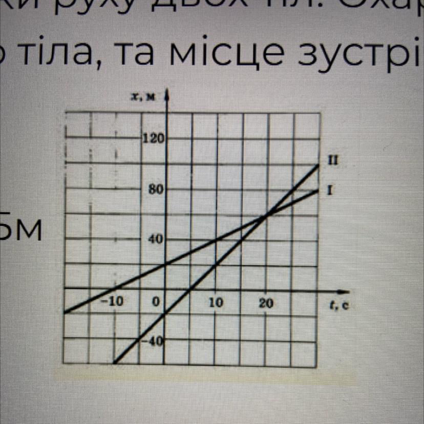 На рисунку представлено графіки руху двох тіл. Охарактеризуйте рух кожного з них і визначіть: рiвняння руху другого тіла, та місце зустрічi тiл. Рiшення прикріпити на перевірку.