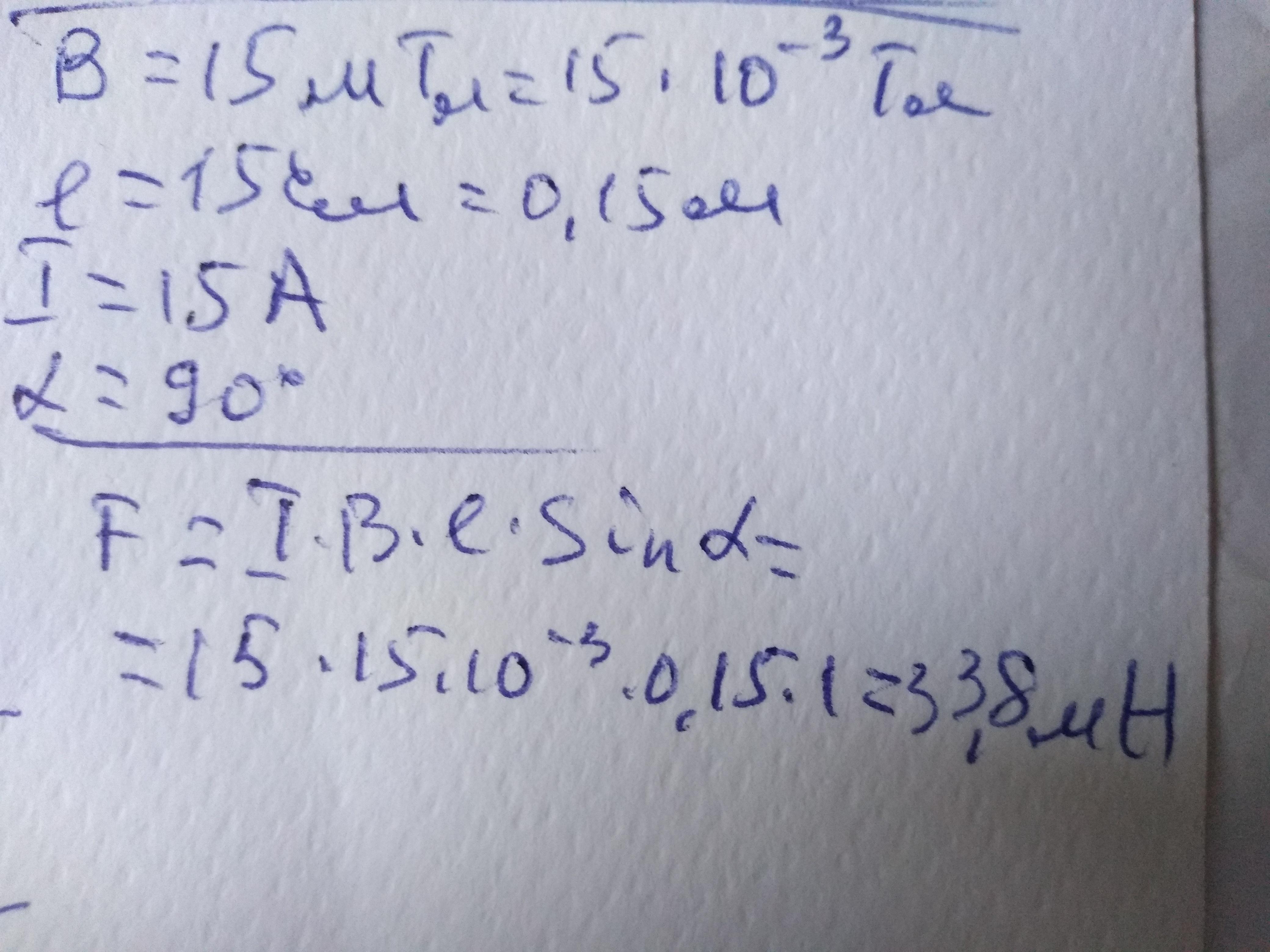 яка сила діє з боку однорідного магнітного поля з індукцією 15 мТл на провідник довжиною 15 см, що знаходяться в магнітному полі? Провідник утворює прямий кут із напрямом вектора магнітної індукції. Сила струму в провіднику 15 А