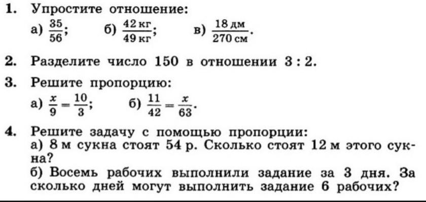 1. Упростите отношение: 42 кг 6) : 49 кг 2. 3. 18 дм 270 см Разделите число 150 в отношении 3 : 2. Решите пропорцию: 6) a) 35 56 10 11 х 42 63 H 4. Решите задачу с помощью пропорции: а) 8 м сукна стоят 54 р. Сколько стоят 12 м этого сук- на? б) Восемь рабочих выполнили задание за 3 дня. За сколько дней могут выполнить задание 6 рабочих?