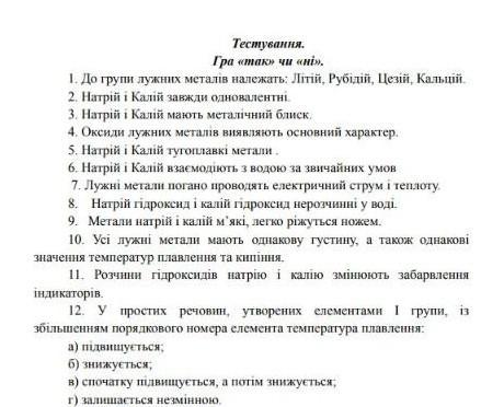 Тестування. Гра «так» чи ні. 1. До групи лужних металів належать: Літій, Рубiдiй, Цезій, Кальцій 2. Натрiй i Калiй завжди олновалентні 3. Натрiй i Калiй мають металiчний блиск. 4. Оксиди лужних металiв виявляють основний характер. 5. Натрiй i Калiй тугоплавкi метали. 6. Натрiй i Калiй взаємодіють з водою за звичайних умов 7. Лужнi метали погано проводять електричний струм i теплоту. 8. Натрій гідроксид i калiй гідроксид нерозчинні у воді. 9. Метали натрiй i калiй м'якi, легко ріжуться ножем. 10. Усі лужні метали мають однакову густину, а також однакові значення температур плавлення та кипіння. 11. Розчини гідроксидiв натрію і калію змінюють забарвлення індикаторiв. 12. у простих речовин, утворених елементами I групи, із збільшенням порядкового номера елемента температура плавлення: а) підвищується; б) знижується; в) спочатку підвищується, а потiм знижується, г) залишається незмінною