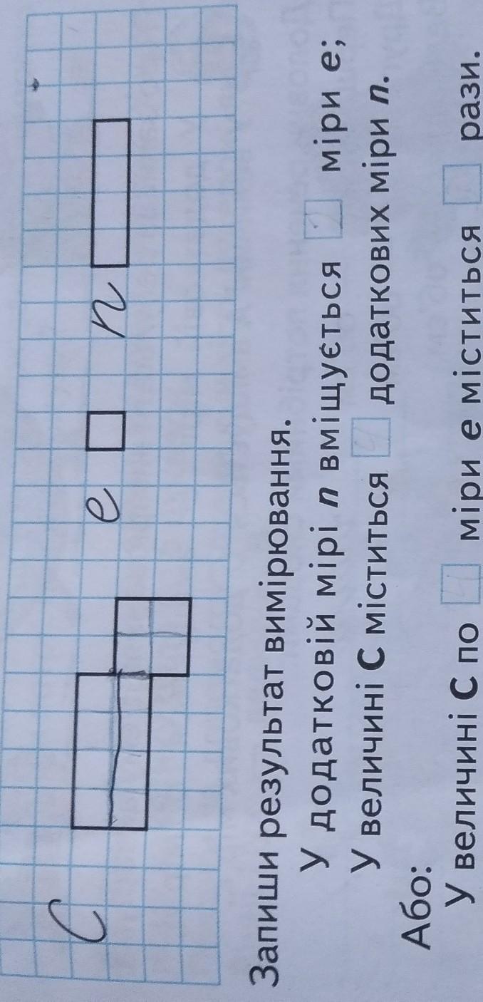 37. Виміряй величину С мірою е. Використай додаткову mipy n. о еп Запиши результат вимірювання. У n У додатковій мірі п вміщується міри е; У величині С міститься додаткових міри п. Або: У величині С по міри е міститься рази.