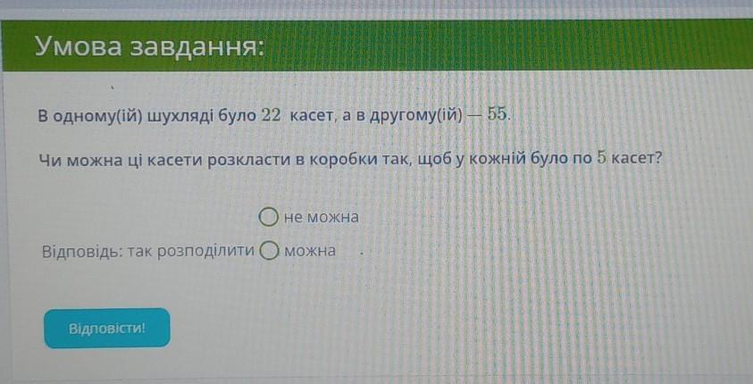 ‼️‼️‼️‼️В одному(ій) шухляді було 22 касет, а в другому(ій) - 55. Чи можна ці касети розкласти в коробки так, щоб у кожній було по 5 касет?‼️‼️‼️‼️‼️