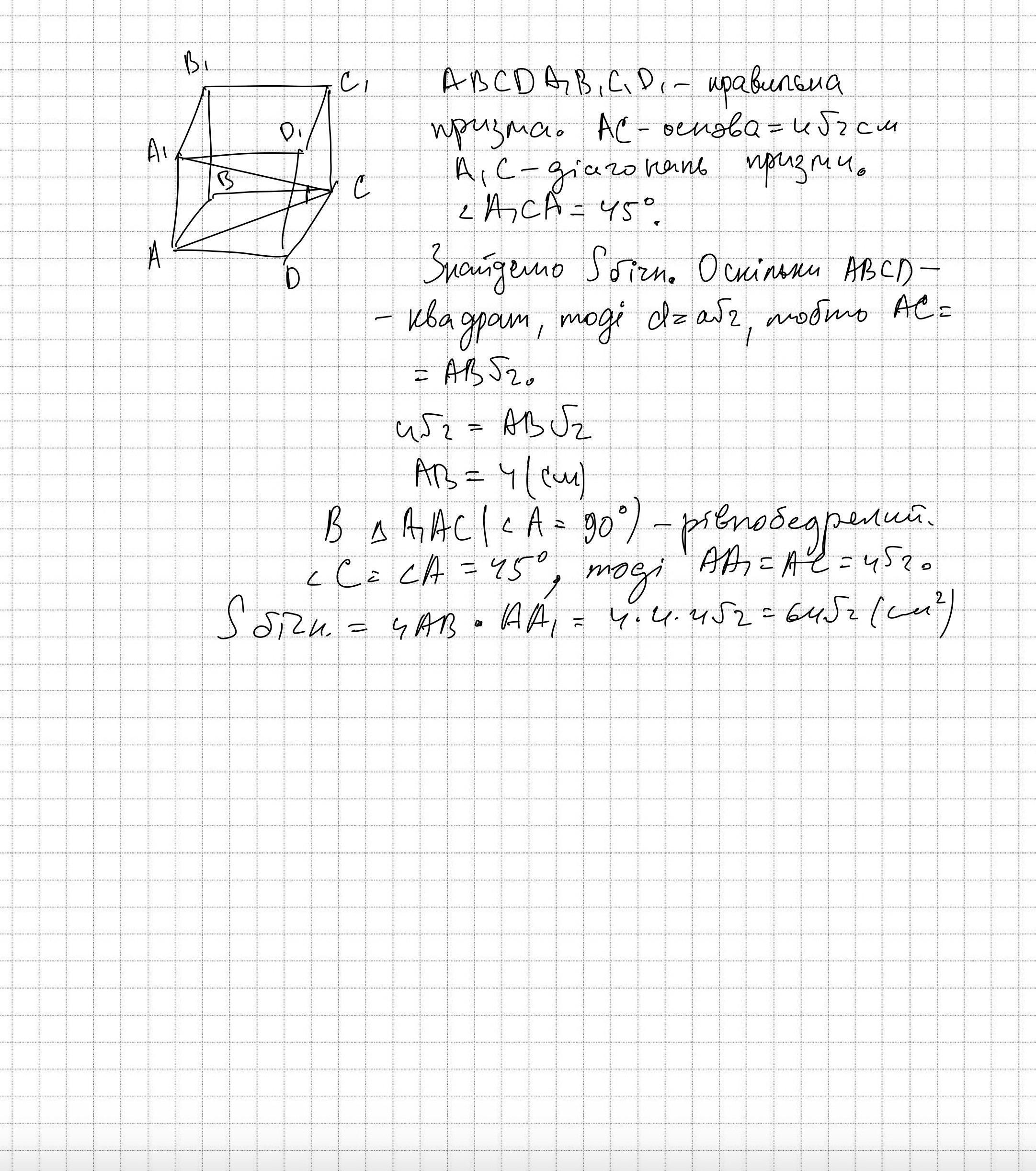 У правильній чотирикутній призмі діагональ основи дорівнює 4√2 см. Знайдіть площу бічної поверхні цієї призми, якщо діаго наль призми утворює з площиною основи кут 45°.