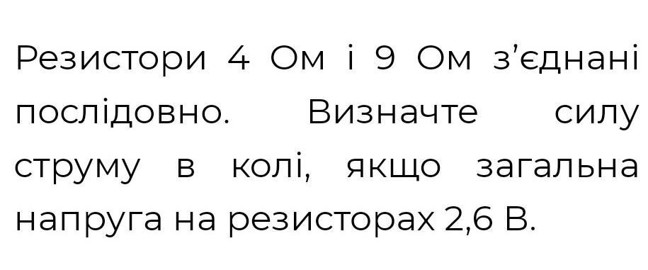 Ваші резистори з'єднані послідовно, тобто опори додаються разом. Отже, загальний опір кола (R) можна знайти, додавши опори 4 Ом і 9 Ом: