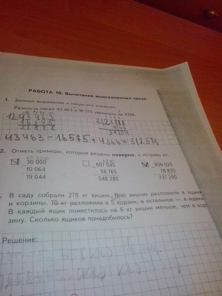 смотри: 1)70÷5=14 это значит что в каждую корзину положили по 14 кг вишни 2)14-6=8кг вишни поместилось в ящики 3) 278-70=208) это значит что 208 кг вишни поместилось в ящики 4)208÷8=26 ящиков получилось