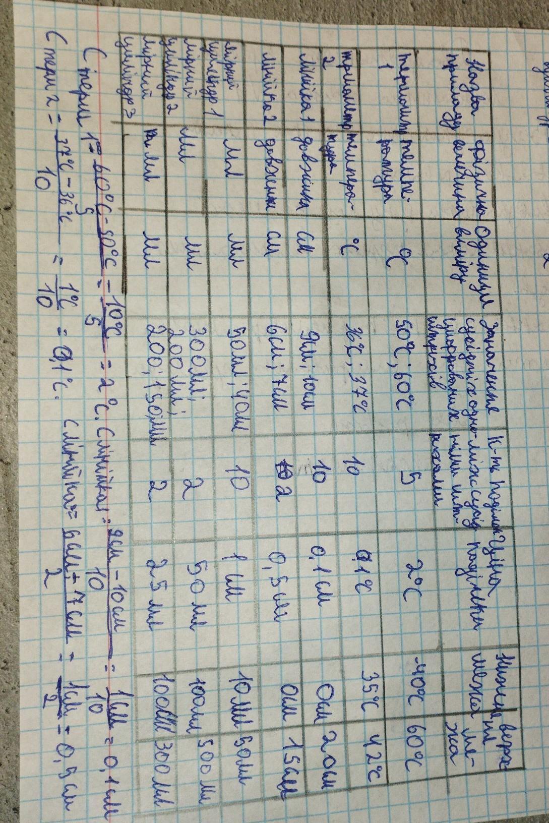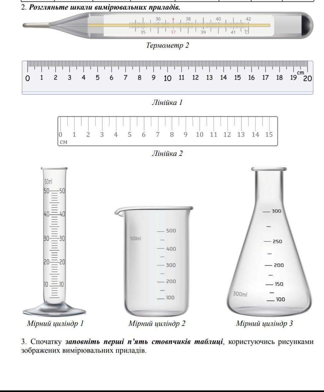 Спочатку заповніть перші п'ять стовпчиків таблиці користуючись рисунками зображених вимірювальних приладів