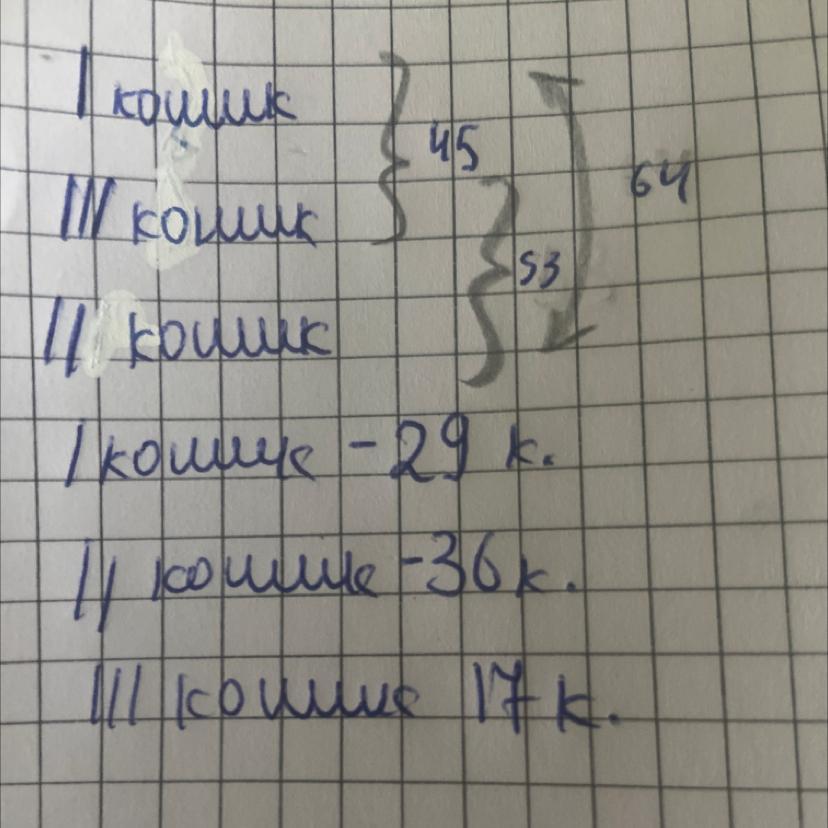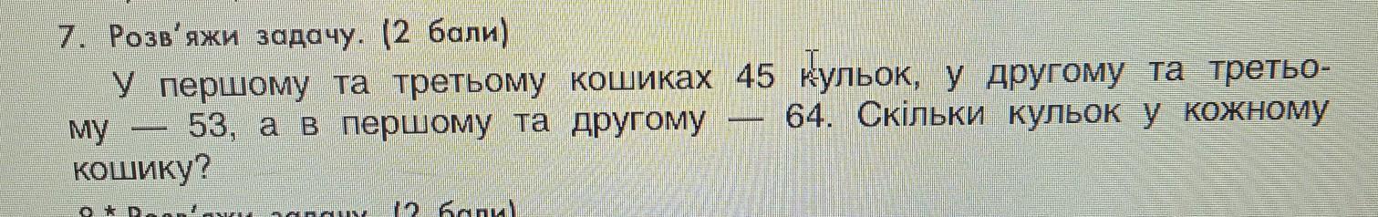 ДОПОМОЖІТЬ З ЗАДАЧЕЮ!!! У першому та третьому кошиках 45 кульок, у другому та третьому- 53, а в першому та другому 64. Скільки кульок у кожному му кошику?