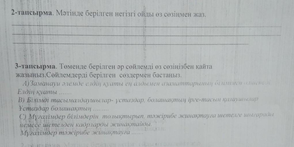 2-тапсырма. Мәтінде берілген негiзгi ойды өз сөзіңмен жаз. 3-тапсырма. Төменде берілген әр сөйлемді өз сөзіңізбен қайта жазыныз.Сөйлемдерді берілген сөздермен бастаныз. А)Заманауи әлемде елдің қуаты ен алдымен азаматтарының біліл Елдің қуаты В) Білімді тасымалдаушылар- ұстаздар, болашақтың ірге-тасын қ Ұстаздар болашақтың ****** С) Мүғалімдер білімдерін толықтырып, тәжірибе жинақтауға ше немесе шетелден кадрларды жинақтайды. Мұғалімдер тәжірибе жинақтауға ILIKAH. 2-ая. Магiнде берілген негізг ойлы от со лежа атрия. S