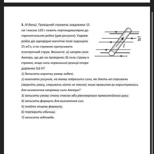 1) Умова задачі: Провідний стрижень завдовжки 15 см і масою 120 г лежить перпендикулярно до горизонтальних рейок. Уздовж рейок діє однорідне магнітне поле індукцією 25 мТл, а по стрижню пропускають електричний струм. Потрібно визначити напрям сили Ампера, що діє на провідник, і силу струму в стрижні, якщо сила нормальної реакції опори дорівнює 0,6 Н.