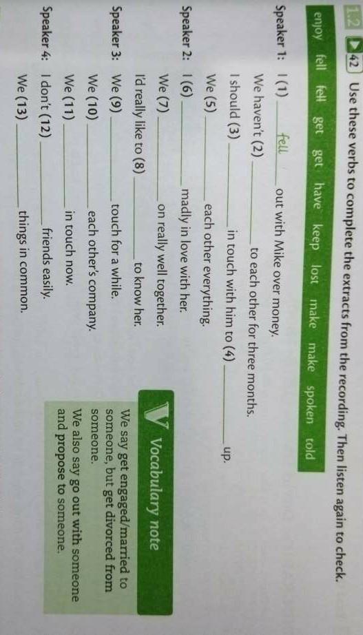 Speaker 1: (1) I fell out with Mike over money. We haven’t (2) spoken to each other for three months. I should (3) get in touch with him to (4) make up. We (5) have told each other everything.