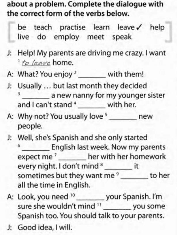 Дж: Ну, она испанка и только-только на прошлой неделе начала ---- английский. А сейчас родители ожидают от меня того, что я буду ---- её с домашкой каждую ночь. Я не против, ---- это будет иногда, но они хотят от меня, чтобы я ---- с ней всё время по-английски.