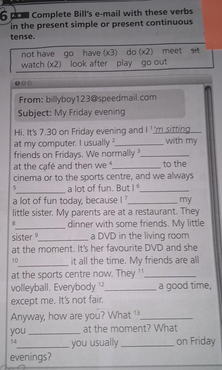 Hi. It's 7.30 on Friday evening and I'm sitting at my computer. I usually **go out** with my friends on Fridays. We normally **meet** at the café and then we **go** to the cinema or to the sports centre, and we always **have** a lot of fun. But I **am not having** a lot of fun today because I **am looking after** my little sister. My parents are at a restaurant. They **are having** dinner with some friends. My little sister **is watching** a DVD in the living room at the moment. It's her favourite DVD and she **watches** it all the time. My friends are all at the sports centre now. They **are playing** volleyball. Everybody **is having** a good time, except me. It's not fair.