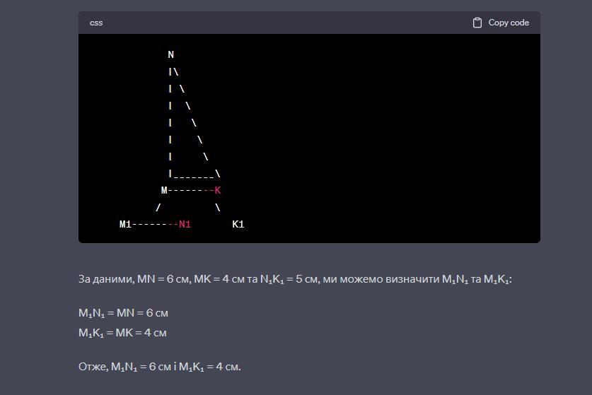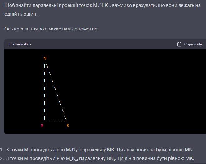 Паралельною проекцією точок MNK що лежать на одній площині M1N1K1 знайдіть M1N1 i M1K1 якщо MN=6cm MK=4cm N1K1=5см (бажано з малюнком)