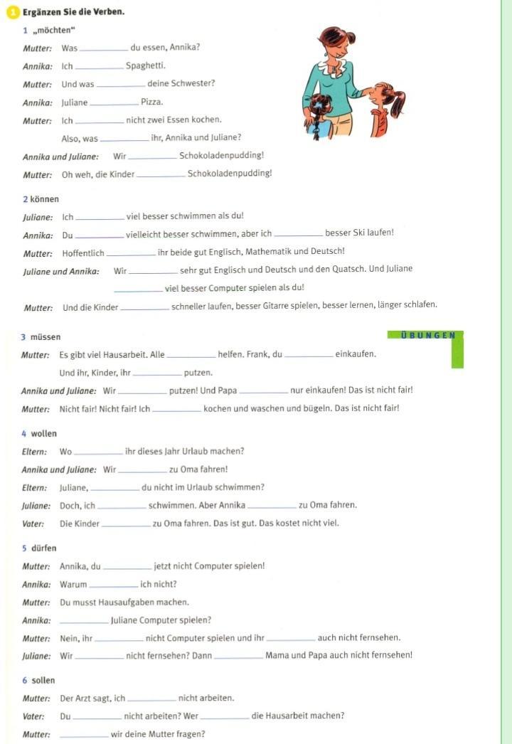 Mutter: Es gibt viel Hausarbeit. Alle müssen helfen. Frank, du musst einkaufen. Und ihr, Kinder, ihr müsst putzen.